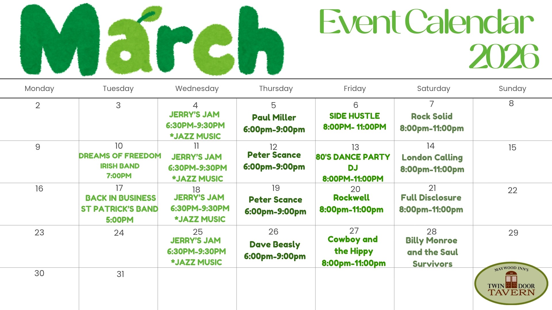 At Twin Door Tavern there is always something special happening to make your experience that much more exceptional!